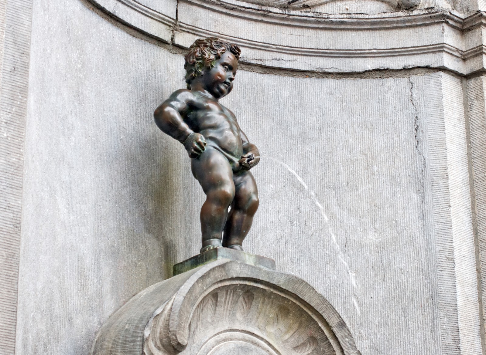 Collocato all’interno di una sontuosa nicchia in stile rococò, il Manneken Pis appare davvero minuscolo e, diciamo la verità, non è nemmeno una scultura di elevato valore artistico. Insomma sarebbe del tutto insignificante, se non fosse diventato nei secoli l’emblema dello spirito ribelle e irriverente della città di Bruxelles.